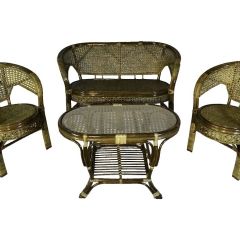Комплект мебели Пеланги 02/15 включает в себя: 2 кресла и столик с красивым плетением снизу и полочкой, съемные подушки из материала улучшенного качества.